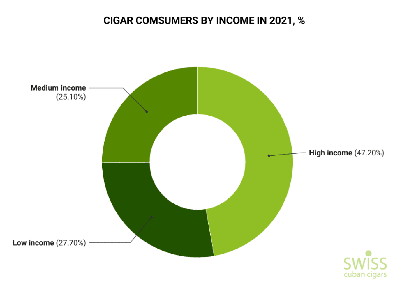 In 2021, the cigar market was dominated by high-income individuals, who accounted for 47.2% of cigar users. Medium-income earners followed closely behind, representing 25.1% of the market. Low-income earners accounted for 27.7% of cigar users.