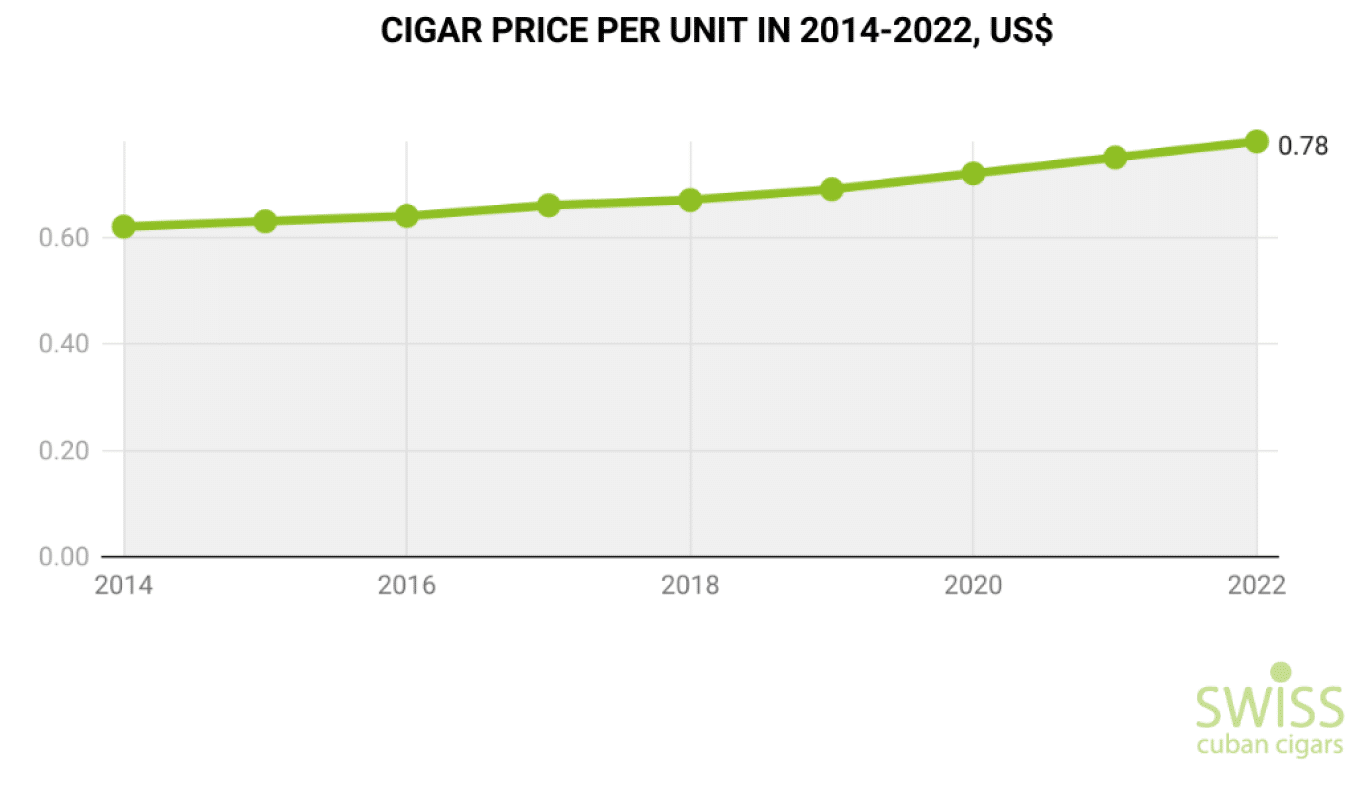 - The price per unit of cigars has steadily increased from 2014 to 2022. In 2014 it was $0.62, and by 2022, it had risen to $0.78. The overall increase was $0.16 per unit over the nine-year period.