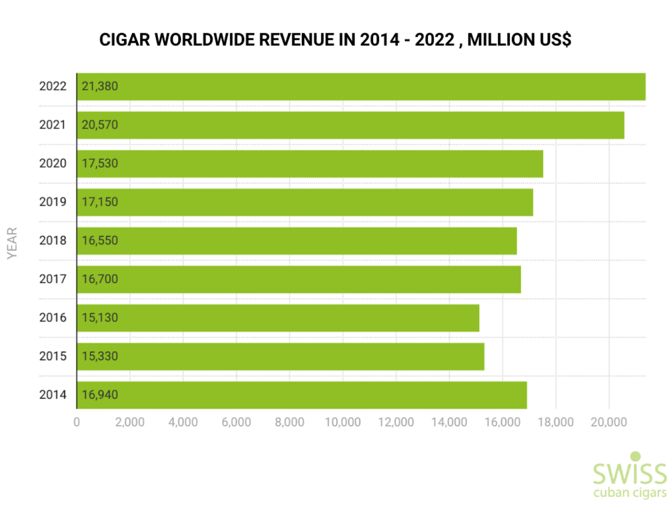 - The global revenue of the cigar industry showed A steady increase over the years. It increased from 16.94 billion US dollars (2014) to 21.38 billion (2022).